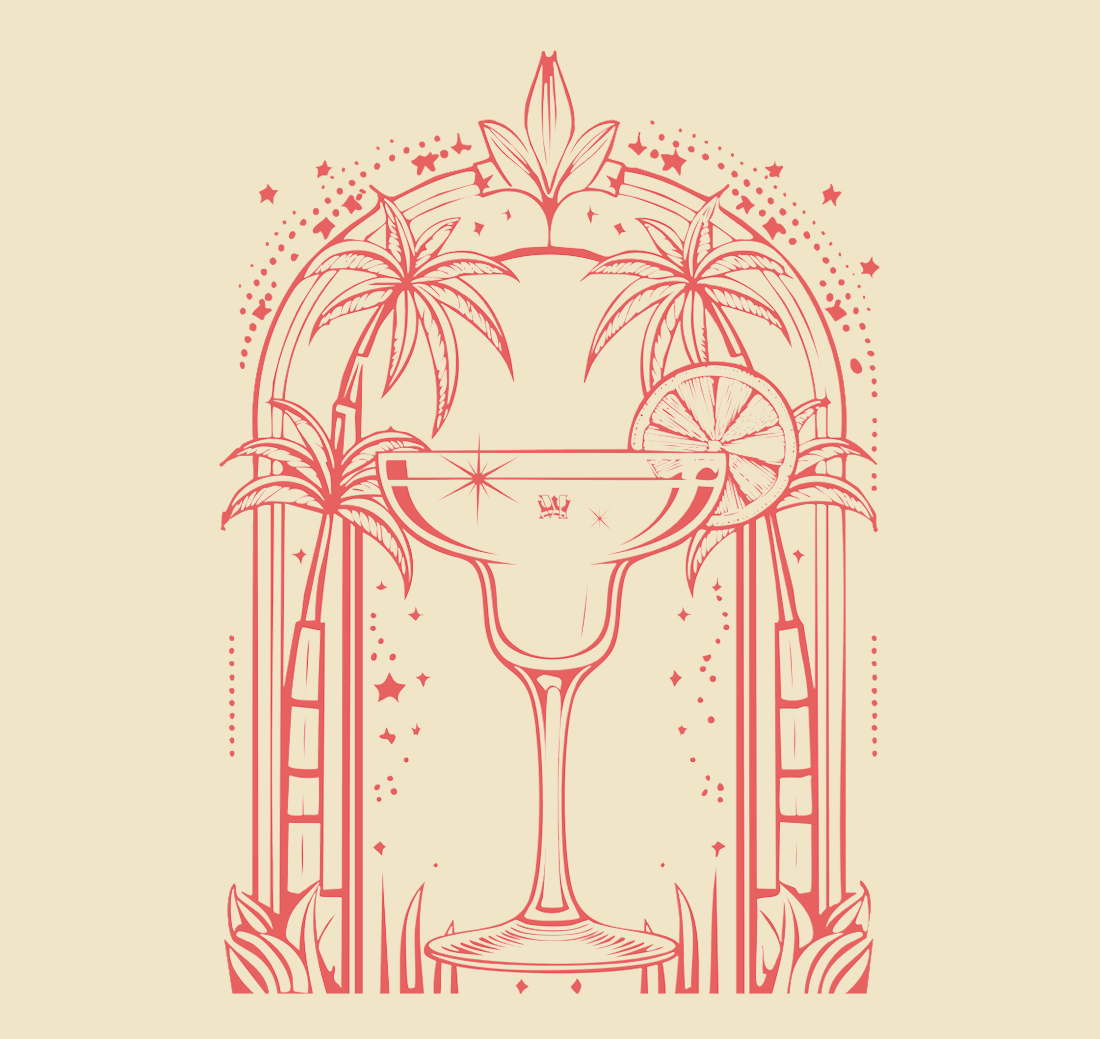 This MIDAS exclusive designed loose fit drop shoulder t-shirt oozes effortless cool. A nod to enjoying the lighter things in life, “Shimmer Margarita Hour” is emblazoned on the front and a striking Art Deco–inspired graphic on the back — complete with palm trees, lilies, and a shimmering MIDAS Margarita.